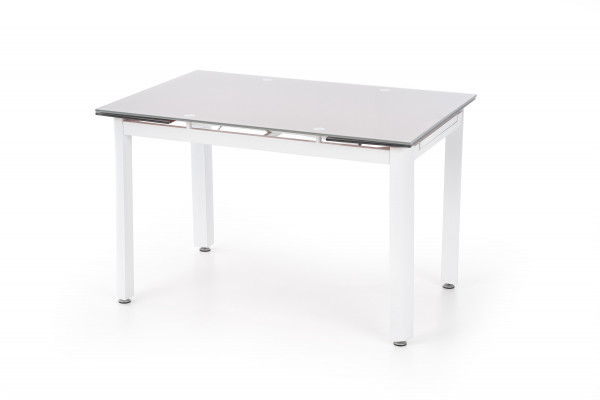 stół rozkładany, wymiary: 120÷180/80/75 cm, materiał: szkło / stal malowana, kolor: szkło - beżowy, stelaż - biały