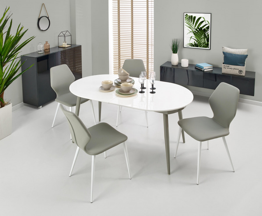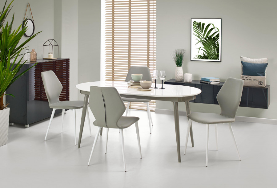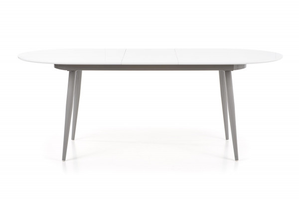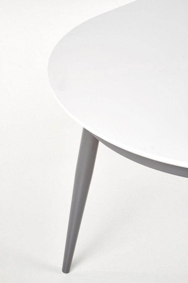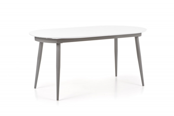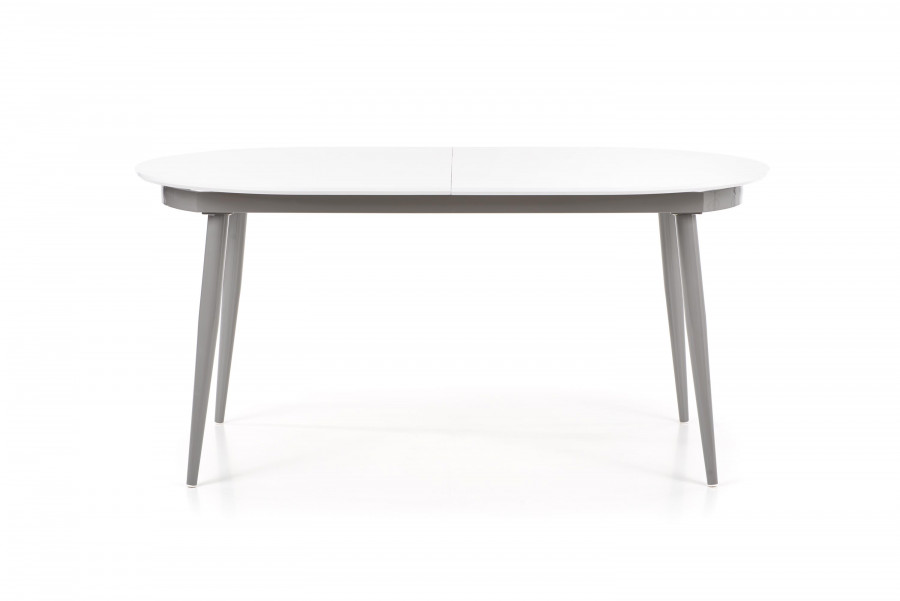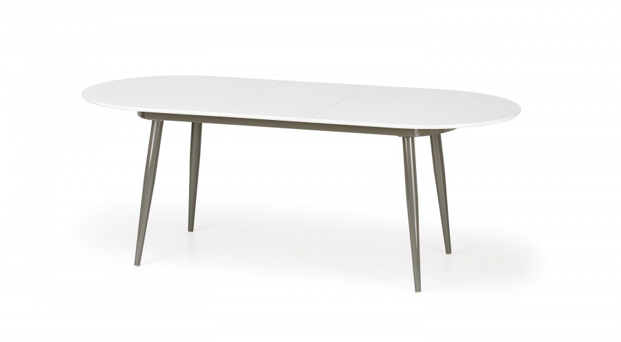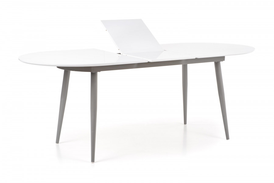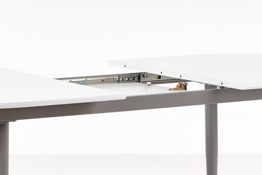 stół rozkładany, wymiary: 160-200/90/76 cm, materiał: MDF lakierowany / stal malowana proszkowo, kolor: blat - popiel, nogi - białe