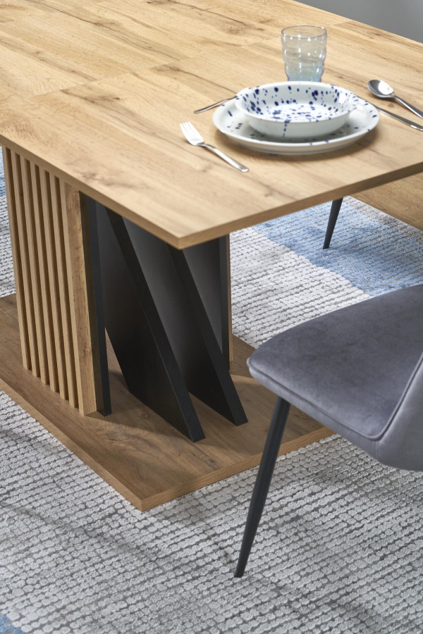 wymiary: 130-175/85/76 cm; stół rozkładany, materiał: płyta meblowa laminowana, kolor: blat - dąb wotan, noga - dąb wotan / czarny