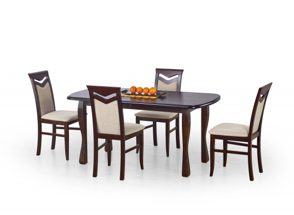 stół rozkładany, wymiary: 160÷200/80/75 cm, materiał: blat - płyta MDF laminowana, nogi - drewno lite (bukowe), kolor: ciemny orzech