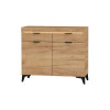 Komoda z kolekcji BRAGI składa się z dwóch części złożonych z szuflady i drzwi, wewnątrz znajdują się półki. Korpus i fronty mebla wykonane z matowej płyty laminowanej. Komoda odnajdzie się w wielu pomieszczeniach w Twoim domu-zarówno w salonie oraz sypialni. Meble wyposażone są w czarne metalowe uchwyty w wykończeniu matowym i ustawione na czarnych nóżkach z wytrzymałego tworzywa. Szuflady zamontowane są na prowadnicach z pełnym wysuwem. Zawiasy drzwi i prowadnice mają mechanizm cichego domyku. Do mebla istnieje możliwość dokupienia oświetlenia LED-NEO-8C w kolorze białym ciepłym, montowanego w wieńcu górnym.