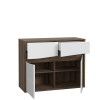 Komoda z kolekcji WHITE SEA została wyposażona w dwie praktyczne szuflady oraz po jednej półce za każdymi drzwiczkami. W meblu zastosowano niezwykle wygodny bezuchwytowy system otwierania frontów. Dyskretne frezowania na krawędziach drzwiczek pełnią rolę uchwytów, co podkreśla minimalistyczny styl mebla. Dekor to połączenie eleganckiej i ponadczasowej bieli w połysku z przydymionym dębem szlachetnym. Łącząc komodę z praktyczną szafką RTV czy stylową witryną z tej samej kolekcji, stworzysz wnętrze nietuzinkowe i niezwykle nowoczesne.