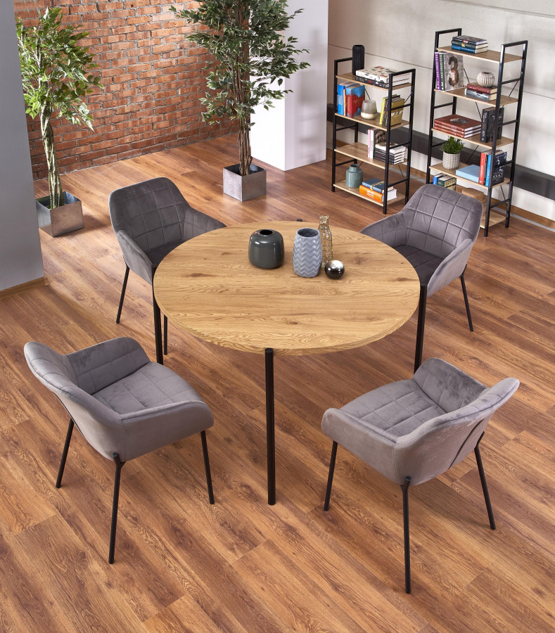 wymiary: fi120/76 cm, materiał: MDF laminowany / stal malowany proszkowo, kolor: blat - dąb złoty, nogi - czarny