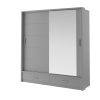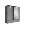 Funkcjonalna, obszerna szafa z dwojgiem drzwi przesuwnych wyposażona we wbudowane, energooszczędne oświetlenie ledowe. Wysokie lustro zamontowane na jednym z frontów mebla powiększy optycznie wnętrze. Korzystanie z szafy ułatwiają dwie głębokie szuflady zewnętrzne. Szafa jest wyposażona w dwa drążki na wieszaki i regał na ubrania. Na obszernej, górnej półce zmieścimy rzadziej używane rzeczy lub walizki. Mebel wykonano z wytrzymałej płyty laminowanej wykończonej trwałym obrzeżem ABS.