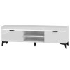Szafka RTV z kolekcji BALDUR wzbogaci aranżację Twojego salonu oraz pozwoli uporządkować przestrzeń, dzięki temu, iż posiada sporo miejsca do przechowywania. Półka w części środkowej oraz wolna przestrzeń po bokach sprawi, iż wszelkie potrzebne przedmioty i akcesoria w Twoim salonie znajdą swoje miejsce i nie będą zaburzać aranżacji wnętrza. Korpus mebla wykonany z płyty laminowanej, fronty z płyty MDF oklejonej folią PVC. W frontach zamocowane są czarne metalowe uchwyty w wykończeniu matowym. Mebel ustawiony jest na czarnych nóżkach z wytrzymałego tworzywa. Zawiasy drzwi mają mechanizm cichego domyku. Do mebla istnieje możliwość dokupienia oświetlenia NEO-13 (pasek LED) w kolorze białym zimnym, montowanego w wieńcu górnym.